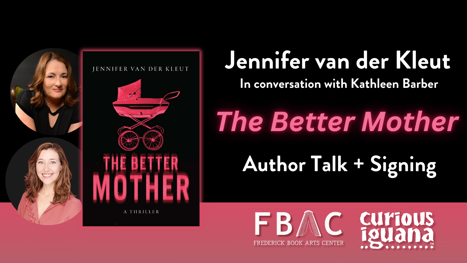 Join us at Frederick Book Arts Center on Friday, March 6, from 6:30-7:30 pm for a thrilling evening with author Jennifer van der Kleut as she discusses her debut novel The Better Mother with fellow author Kathleen Barber. Following a surprise pregnancy after a fling with Max, Savannah decides to reach out to him and his girlfriend, Madison, about co-parenting; however, Madison’s initial excitement turns into obsessive control, challenging Savannah’s own life plans. Following the discussion, Jennifer will answer questions and sign books. Copies of The Better Mother will be available for purchase at the event.